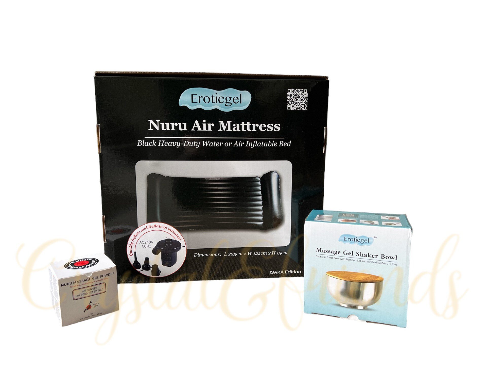 Introducing our all-inclusive Nuru Massage Bundle, featuring our Inflatable Nuru Mattress, exquisite 100g Nuru Massage Gel Powder and Shaker Bowl. Elevate your intimate moments and embark on a journey of passion, pleasure, and pure bliss.