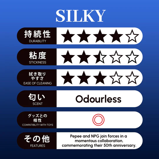 Celebrate a remarkable milestone with PEPEE’s Silky Lotion, a collaboration between Pepee and NPG, two esteemed Japanese lotion companies, in honor of their 50th anniversary. Encased in a refreshing blue bottle, this extraordinary lotion delivers a silky smoothness that is truly exceptional for onahole use.